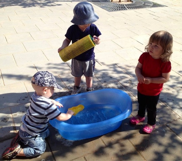 Vad händer ute på gården en förmiddag? Bygg och konstruktion, en vask skapas, vattenlek, stafflimålning, där några miniorer är delaktiga och visar hur man målar med vattenfärg, fönsterlek med seniorerna, mellanmål, några barn hade egen samling, cykelutmaning och lek i sandlådan är en del av vad en förmiddag kan innehålla.